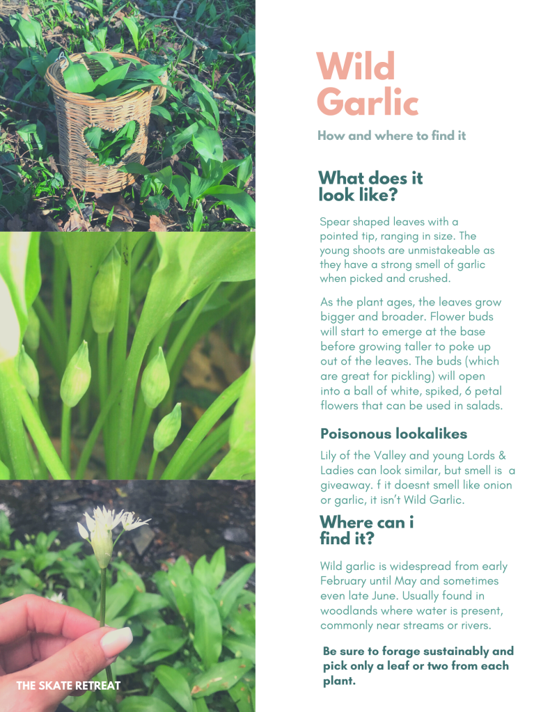 Wild Garlic was one of the first plants I learnt to identify as a teenager, and is still one of my favourites to forage today. I have been foraging, and teaching others to forage, for as long as i’ve been skating (almost 20 years!) and is the reason I decided to include guided walks and workshops as part of our 3 day residential skate retreats.