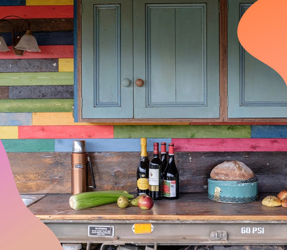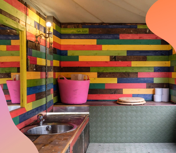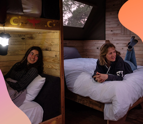 Ex army trucks converted into luxury sleeping quarters. Two are kitted out with a double bed and bunk beds, sleeping 4. The third truck has a double bed and can be booked out as private accommodation for 1 or 2 guests. All are equipped with table + chairs, bench area, lanterns and fairy lights. The kitchen features 4 gas hobs, pots pans + cutlery, cool boxes (bring your own ice!) and 2x usb sockets.